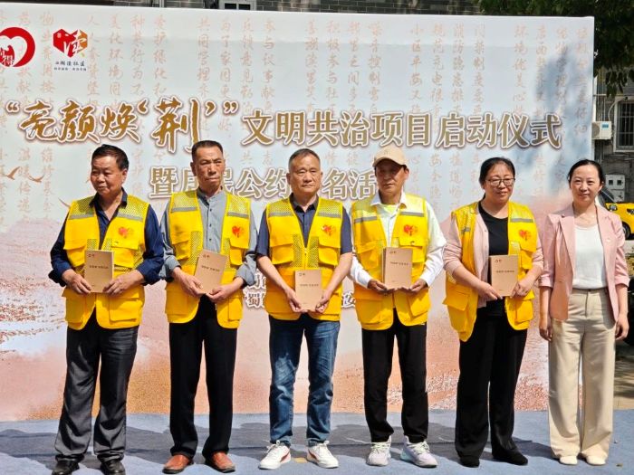4月22日区紫荆小区内暖意融融、气氛热烈,"亮颜焕荆"文明共治项目启动仪式在此隆重举行。镇相关部门领导、爱心企业家、志愿者及居民代表近百人齐聚一堂,以"党建引领+居民自治"模式,共同开启文明治理新征程。
