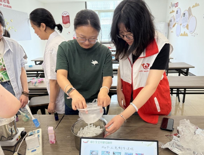 “艾草,自古以来就是驱邪避疫的象征,端午时节,家家户户都会挂艾草以祈求平安。今天,我带大家一起亲手制作艾草皂,不仅传承了这份传统的美好寓意,也让我们的生活多了一份仪式感和乐趣。”工作人员话音刚落,现场响起了热烈的掌声。紧接着工作人员便讲解并演示手工皂的制作方法:首先将皂基用电磁炉加热融化成液体,然后加入艾草精油,让皂液体有艾草的香味和颜色,再用烧杯倒入模具中,等冷却过后,艾草香皂就做好了。大家有条不紊地开始动手制作原液,经过溶解、调色、搅拌、入模等一系列程序,一块块造型精致、香气宜人的手工艾草皂脱模而出,大家看着自己亲手制作的手工皂,闻着艾香的清香味,纷纷露出笑颜。