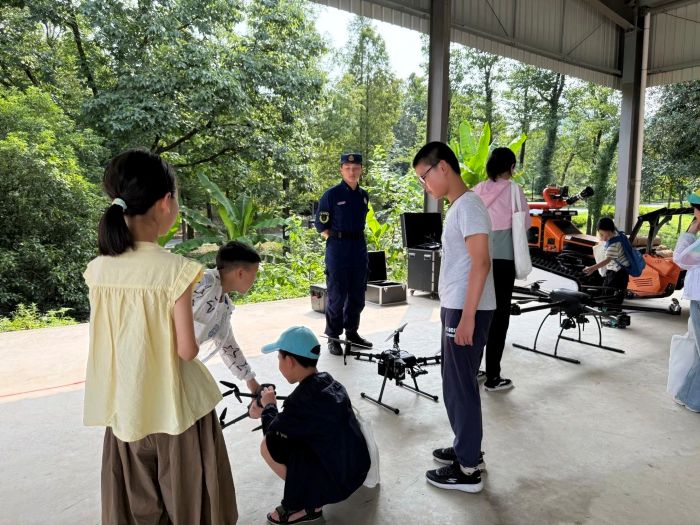 活动中,在消防员的带领下,孩子们依次参观了专业救援设备和不同功能的消防车。随着消防员的专业讲解和现场操作演示,水带、风力灭火机、无人机等器材的功能和使用变得生动具体,这些灭火救援装备,无不凸显科技在应急救援领域的运用成果。在装备演示环节,森林消防员现场示范设备操作原理,吸引孩子们思考提问。在营区参观环节,孩子们还互动观摩队列训练、擒敌拳等训练科目,感受森林消防队伍严谨的纪律作风和良好的精神风貌。走进宿舍,森林消防员“手把手”传授内务整理技巧,展现准军事化管理细节,引导孩子们将行为规范融于日常生活。