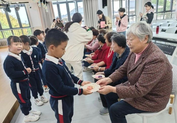 最动人的环节当属孝亲互动,志愿者早已将重阳糕分装完毕,由孩子们捧着糕点走到老人面前,奶声奶气地说着“奶奶请吃重阳糕”,老人们接过糕点细细品尝,脸上满是欣慰笑容。紧接着,孩子们主动走到老人身后,用小手轻轻捶背揉肩。