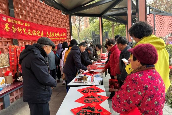 腊月飘墨香,新春送暖阳。1月28日上午,谢桥口袋公园内年味十足、暖意融融,文峰社区新时代文明实践站携手宜兴市老干部大学、爱心一家义工站、宁波银行宜兴支行、王俊推拿等共建单位、社会组织共同举办“我们的节日·春节:墨香妙笔送福迎春 志愿服务暖心同行”主题活动,通过丰富的文化传承与贴心的便民服务,为社区居民送上了一份诚意满满的新春贺礼。