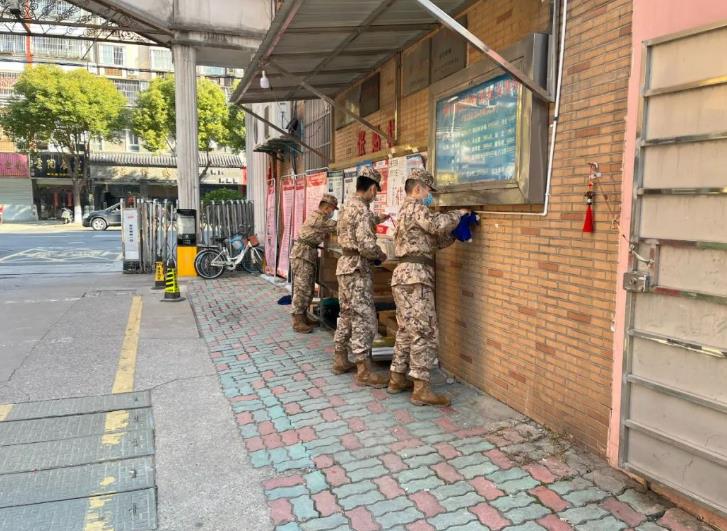 年轻党员身穿红马甲,手拿垃圾夹和垃圾袋,对一些楼道死角、绿化带进行了清理。武警部队主要负责清理小区路面垃圾,擦拭公告栏以及清除地面“牛皮癣”。