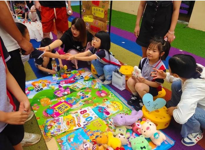“走过路过不要错过,全部便宜啦,快来买呀!”“阿姨,你需要买书吗?”从不远处就听到了孩子们的叫卖声,让我们去看看是哪里的小朋友在卖东西。哦!原来是儿童跳蚤市场的孩子们在吆喝呀,让我们一起走进活动现场看看吧。活动现场小朋友带着从家里整理出来的大大小小、各式各样的玩具和学习用品,摆起小摊做起“生意”来。有的自带纸板小广告、有的现场编出广告语、有的小朋友看到自己的“商品”被人喜爱,迫不及待地就要送给要买的小伙伴,各种趣事在活动现场不断上演。整个跳蚤市场熙熙攘攘,卖得起劲儿,买得也欢实,热闹非凡。