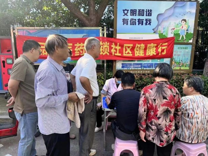 虽然天气炎热,现场参与人员却井然有序。来自三品堂医药的医务人员耐心地与每一位前来诊治和咨询的居民交流,为他们提供测血压、测血糖、用药指导等服务,并向他们讲解健康保健知识。同时,医务人员还为前来参加义诊活动的居民朋友们发放了健康管理手册,特别叮嘱他们夏日要合理膳食、均衡营养,提醒他们要选择合适时间参加锻炼,定期体检,有身体不适要及早到医院进行检查治疗,养成健康的生活习惯。