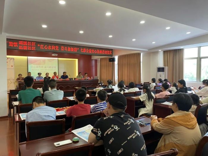 为热烈庆祝中国共产党成立102周年,贯彻落实习近平总书记关于青少年工作的重要思想,7月3日下午,汤渡社区、画溪社区共同举办“红心永向党 奋斗新征程”主题教育活动启动仪式暨“花浪朵朵·七彩公益安心托班”开班仪式。丁蜀镇教育关工委蒋正怀副主任、丁蜀镇政法关工委纪岳生副主任、丁蜀镇成校王静雯主任、汤渡社区党总支书记闵震涛、画溪社区党总支书记鲍燕、丁蜀镇交警中队范逸雯警官、丁山派出所社区民警丁双其、画溪社区关工委“五老”宣讲员冯红芳老师及徐菊英老师出席了本次活动。