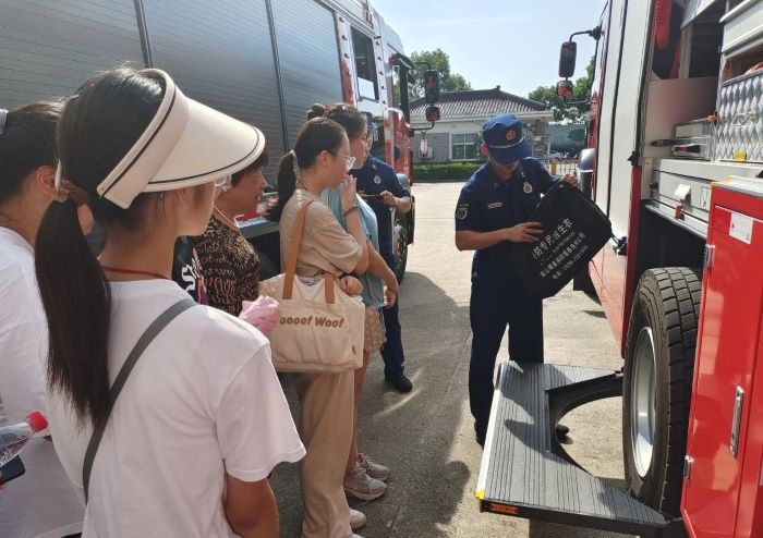 第一次近距离观察消防车,同学们的好奇和欣喜之情溢于言表,消防员一一向同学们介绍了消防车、消防器具等相关消防器具,并讲解了用途和使用方法。