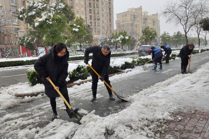 在寒冷的环境中,大家不畏严寒,迅速行动,撒盐将积雪化开。网格员们团结协作,穿梭在社区的大街小巷,及时清理了道路的积雪,还分区域对辖区出入口及周边车辆干道、人行道等进行清雪除冰工作。