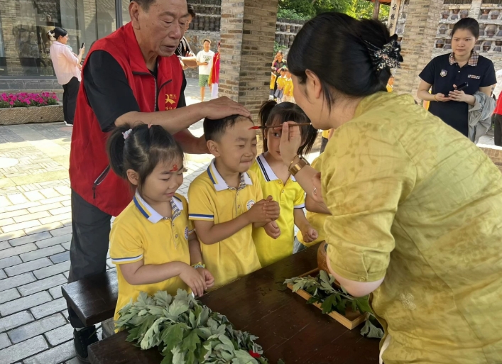 今朝吾辈过端午,吟诗诵读敬先贤,师生齐诵苏轼的《浣溪沙·端午》。推荐绘本《端午日》感受沈从文笔下的中国传统节俗之美。方寸书签寄情意,在扇子上提诗,送给现场的小朋友们。“雄黄画额”的习俗是汉族人流传下来的。在端午节以雄黄涂抹额头,可驱避毒虫。用雄黄酒在额头画王字,一借雄黄以驱毒,二借猛虎以镇邪。