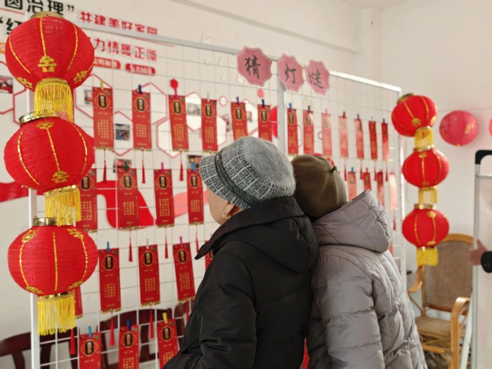 活动现场张灯结彩,满室的红灯笼洋溢着喜庆的节日氛围。居民们围在在灯谜架前驻足思考,有奖竞猜的形式大大激发了大家的参与热情;居民们有的独自冥思,有的结对讨论,现场气氛热烈欢快。谜面不仅涵盖了历史、文化等常识,还有垃圾分类的知识,让居民们在猜谜中进一步强化了垃圾分类的意识。