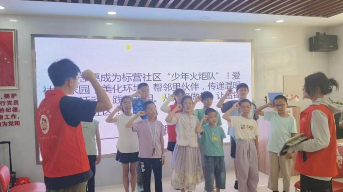 在宣誓环节,孩子们齐聚台前,举起右拳庄严宣誓:“我志愿成为标营社区少年火炬队成员!爱社区家园,帮邻里伙伴,做志愿活动……让雷锋精神照亮社区!”