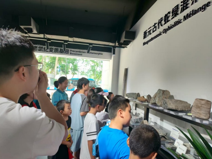 “家里装修用的大理石台面,是由哪种岩石 ‘变身’而来的?”“这块黄色的矿石表面亮晶晶的,像撒了糖霜,猜猜它可能是什么矿物?”……吴牧龙成功认出一块花岗岩,兴奋地拉着志愿者分享:“我家阳台的栏杆就是这种石头,以后我要好好研究它们!”活动结束时,孩子们的笔记本上记满了矿物名称,眼里闪烁着探索的光芒。标营社区“少年火炬队”成员们,在社工和大学生志愿者的带领下,前往中国地质调查局南京地质调查中心开展研学活动,在斑斓矿石与科技设备间徜徉,于互动中触摸地球奥秘,让科学种子悄然萌发,开启一场生动有趣的地质探秘之旅。本次活动不仅让孩子们通过参观地质标本和科技设备,了解了地球演化、岩石矿物等地质知识,感受了地质科学在资源勘探、灾害防治等领域的应用,还引导他们发现地质科技与生活的联系,提升了观察分析和创意表达能力,进一步激发了他们对地质科学的探索兴趣。同时,也增进“少年火炬队”成员间的互动和团队协作,加强了的团队建设。