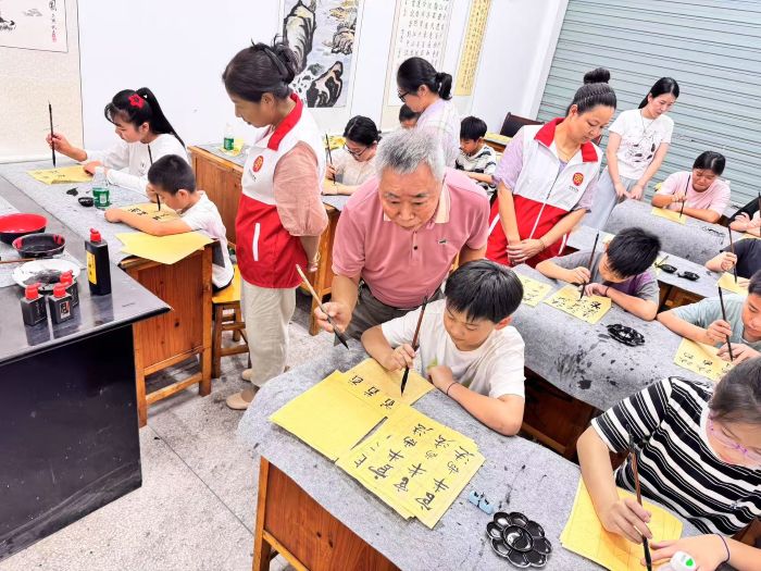 “握笔要稳,起笔要有力。”2月9日上午,尽管室外寒意袭人,但周铁镇下邾社区的百合花美育基地内却暖意融融。12名辖区儿童齐聚一堂,正在参加由社区关工委牵头组织的寒假公益托班书法课。来自周铁竺西书画院的周正军院长正俯身握着一个孩子的小手,一笔一划地示范着“福”字的写法……