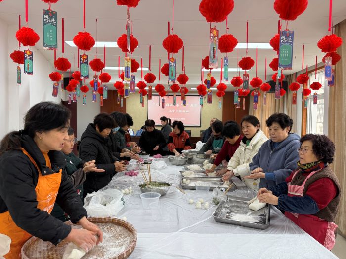 活动当天,社区活动室被装点得喜气洋洋。一盏盏红彤彤的灯笼高高挂起,一条条妙趣横生的谜语随风轻摆,将现场装扮成一片欢乐的海洋。居民们或携家带口、或邻里结伴,纷纷前来参与猜灯谜活动。谜面内容丰富多样,既有传统字谜、成语谜,也有贴近生活的趣味谜题,既考验智慧又充满乐趣。大家时而凝神沉思,时而热烈讨论,猜中谜底时的欢呼声此起彼伏,现场洋溢着欢声笑语。"这个谜底是'团团圆圆',正好应景!"周叔叔拿着刚猜中的灯谜,笑得合不拢嘴。猜完灯谜,居民们围站在一起,开始体验元宵制作。社区特邀的"巧手达人"路阿姨现场示范,从揉糯米团、包馅料到搓圆成型,一步步讲解制作技巧。居民们跃跃欲试,纷纷动手尝试,不一会儿,一个个圆滚滚、白胖胖的元宵便摆满了托盘。大家边包边聊,分享着各自的节日记忆和家常趣事,其乐融融。