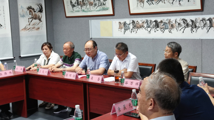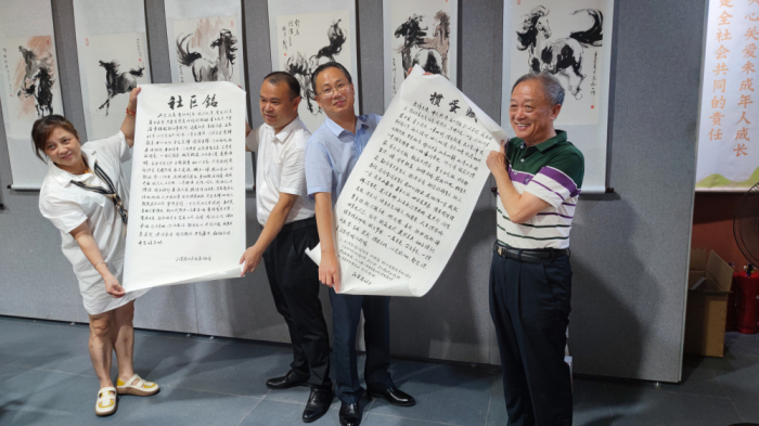 江苏省民政厅社区处一级调研员梁荟,江苏省社区发展协会副会长、秘书长王元刚,江苏省社区发展协会副秘书长、江苏社区网主编顾国新,宜兴市屺亭街道办事处副主任张明强等领导和有关方面的人士出席了活动。梁荟代表省民政厅社区处致词,谷万祥先生与大家分享了创作经历,王元刚发表了感言。开幕式上,江苏省社区发展协会还向宜兴市屺亭街道奔马社区赠送了一批书籍与《社区铭》《掼蛋赋》制式书法挂件,宜兴一逸轩艺术馆馆长冯国平向画展敬赠书法作品“马到成功”,谷万祥先生向冯国平回赠了一件奔马作品。
